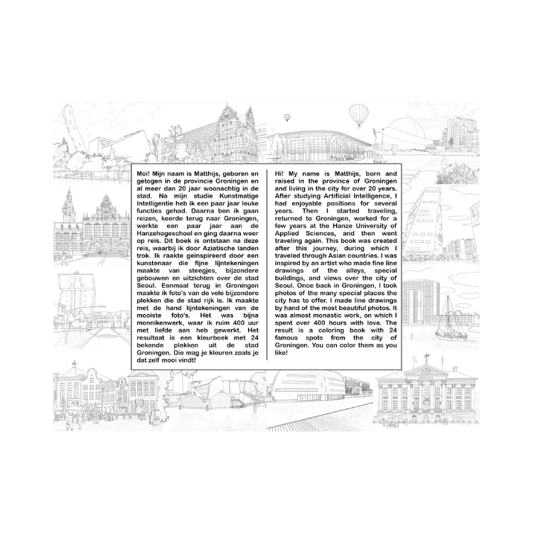 Bekijk de stad Groningen door een unieke en artistieke lens. "Kleurrijk Groningen: Kleur Groningen zoals jij het graag wil zien" brengt je 24 prachtig handgetekende pagina's, elk gebaseerd op echte foto's die de essentie van een aantal mooie locaties van Groningen vastleggen.